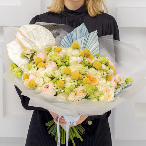В состав букета "Еллоу Концепт" White вошли: - Орнитогалум — 7 шт. - Пионовидная роза Вайт Охара — 10 шт. - Пионовидная роза Девид Остин Джульетта — 11 шт. - Эустома Белая — 8 шт. - Роза кустовая Сноуфлейк (белая) — 10 шт. - Антуриум — 3 шт. - Краспедия — 21 шт. - Сухоцветы Пальма копье — 2 шт. Каждый компонент создает уникальную текстуру и общее настроение букета, а разнообразие форм и оттенков белого делает его универсальным вариантом для любого повода.