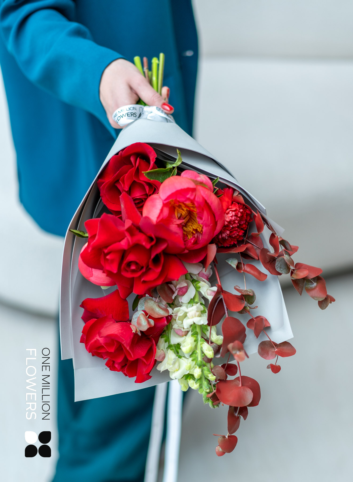 Букет "Этна Х Корал" - это настоящее произведение флористического искусства, которое воплощает в себе гармоничное сочетание ярких и нежных оттенков. Основу букета составляют благородные красные розы Эквадор Фридом, чья насыщенность и глубина цвета символизируют страсть и любовь. Эвкалипт привносит в композицию свежие нотки зелени, а благодаря Антиррину бразильские всходы добавляют утонченности и изысканности.