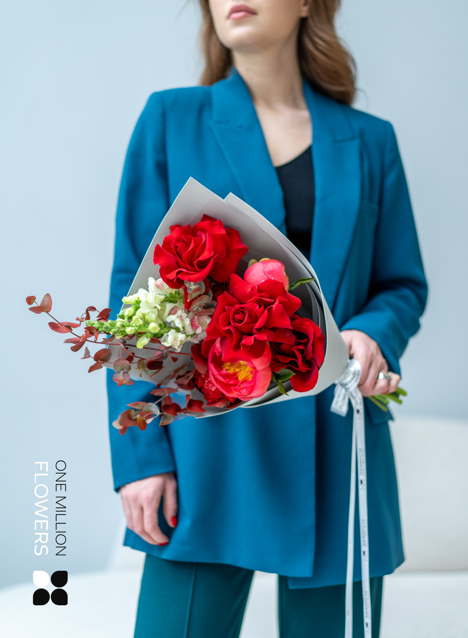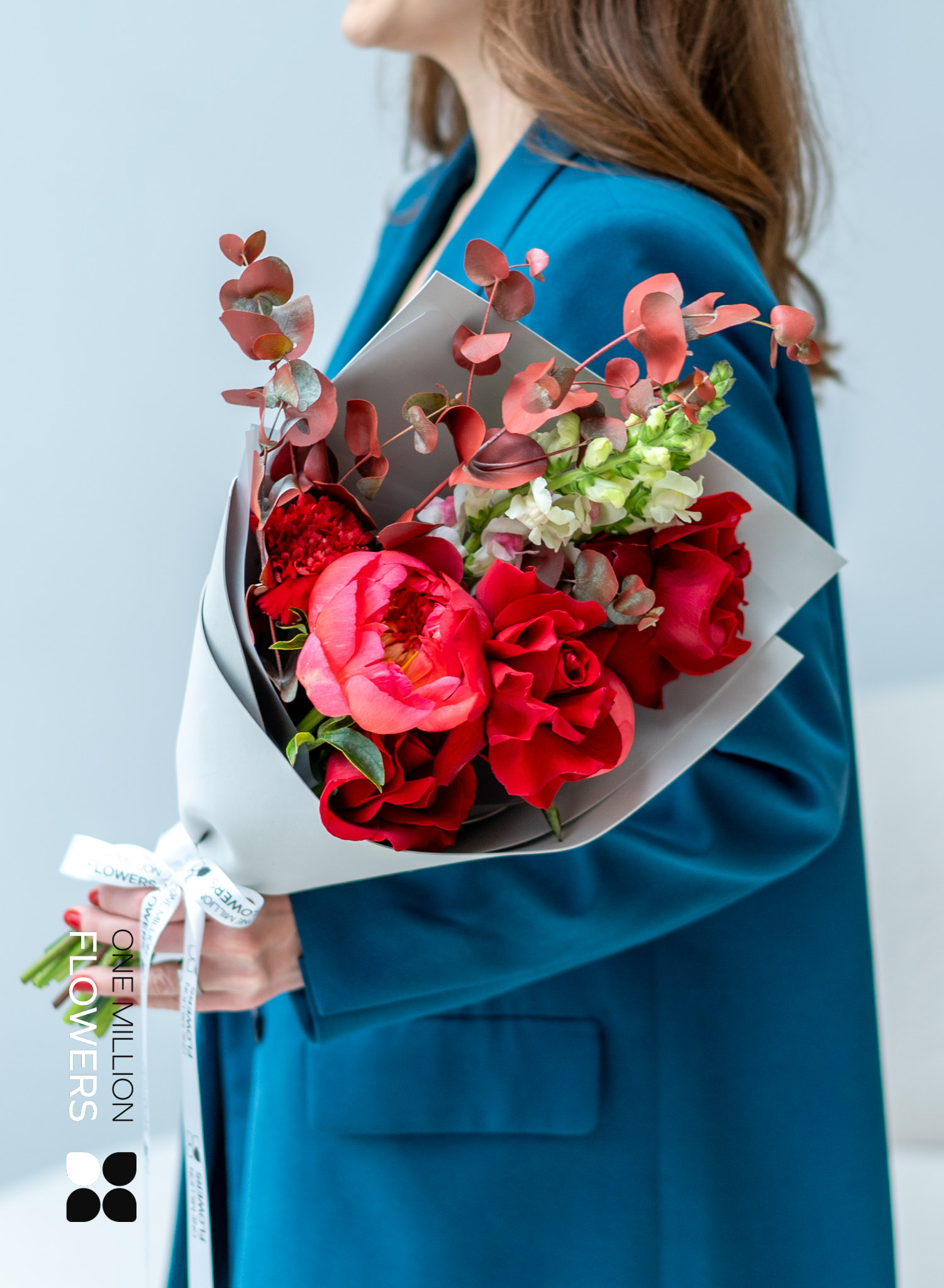 Нежный лимонный диантус (гвоздика) разбавляет палитру своим светлым акцентом, придавая букету легкость и воздушность. Завершающий штрих – PREMIUM пионы кораллового цвета, которые создают эффектную игру контрастов своими роскошными лепестками.