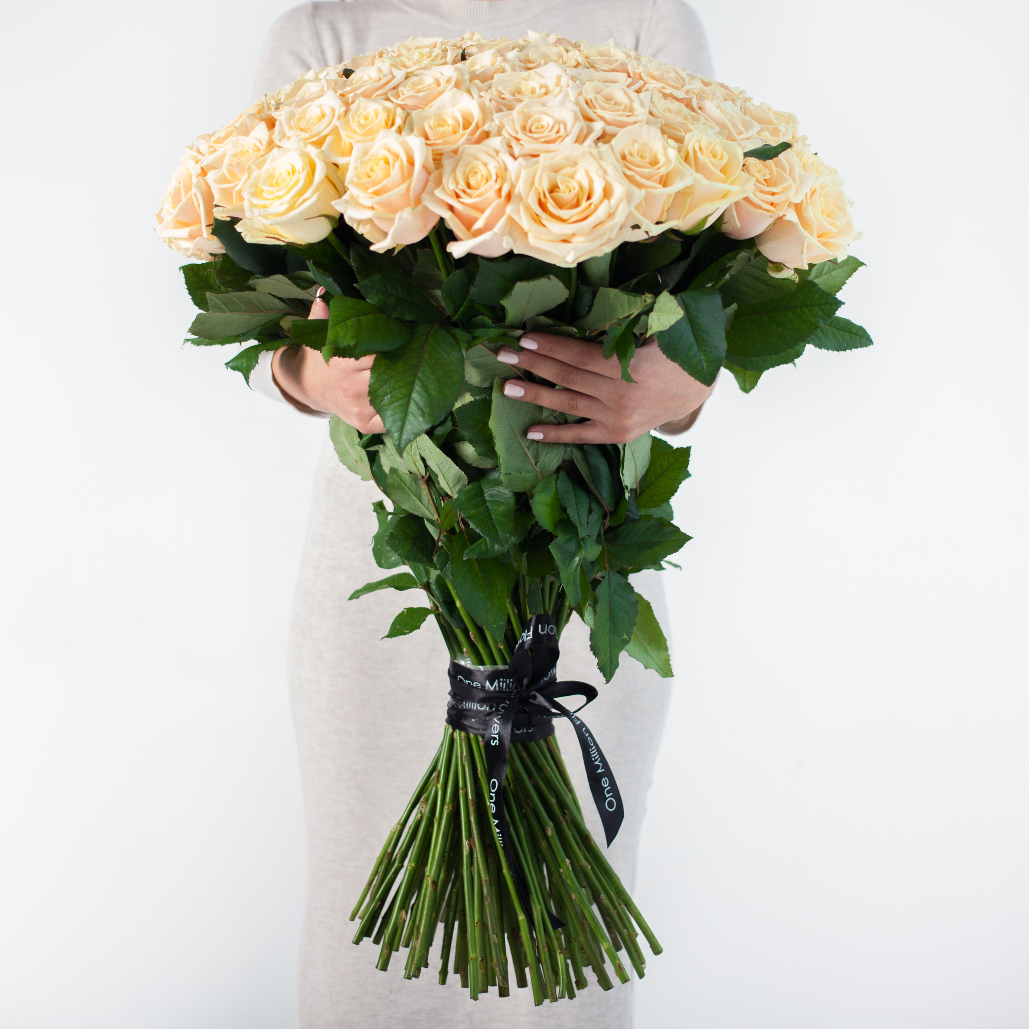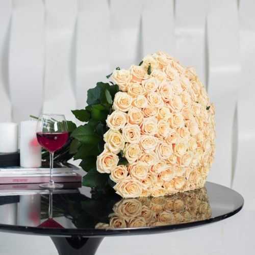 Преимущества этого букета просто не перечислить! Кремовые розы имеют потрясающую текстуру лепестков, что придает им естественную прелесть. Богатство окраски цветка добавляет особый шарм каждому бутончику. Столь обширное количество роз делает этот букет поистине феноменальным произведением искусства.