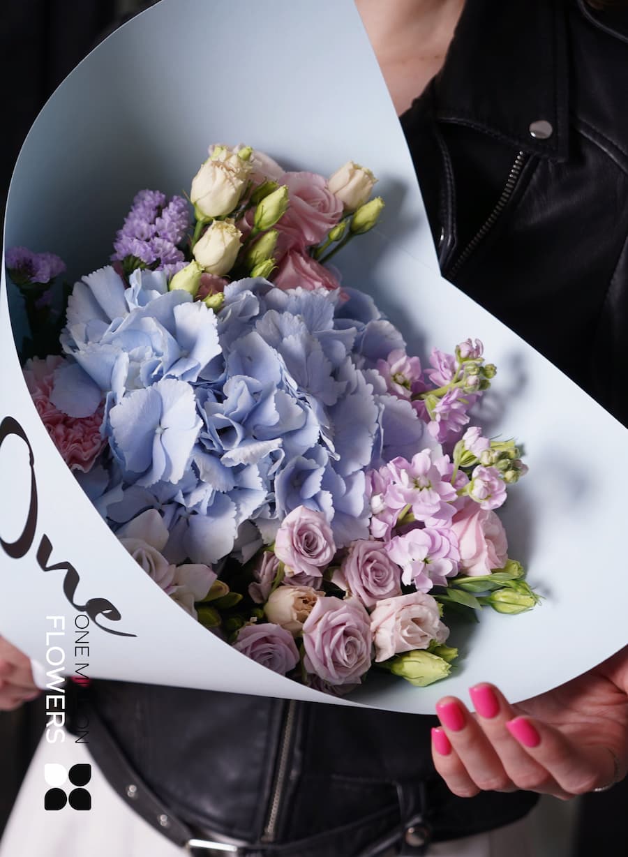 В составе букета "Луно Бруно" Blue вас ждут: одна кустовая роза Сильвер шадоу (фиолетовая), две маттиолы сиреневого цвета, две эустомы розового оттенка, одна голубая гортензия и одна статица. Такое сочетание цветов удивит даже самых искушенных ценителей. Каждый элемент подобран таким образом, чтобы создать гармоничную композицию, полную ярких эмоций и нежности.