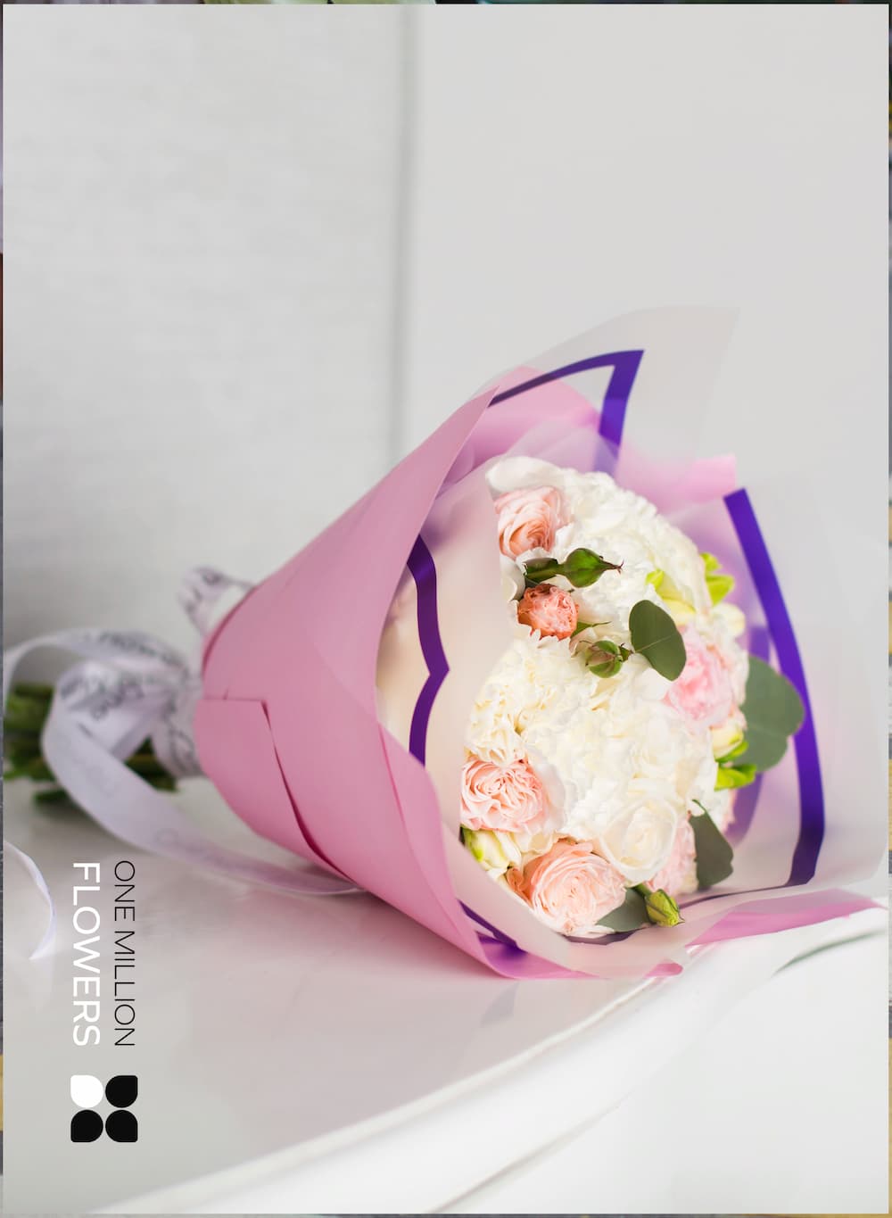 - Диантус белый (Гвоздика) — 11 шт. - Фрезия белая — 6 шт. - Пионовидная роза Пинк Охара — 4 шт. - Эустома Белая — 4 шт. - Роза кустовая Бомбастик Кремовый (нежно) — 9 шт.