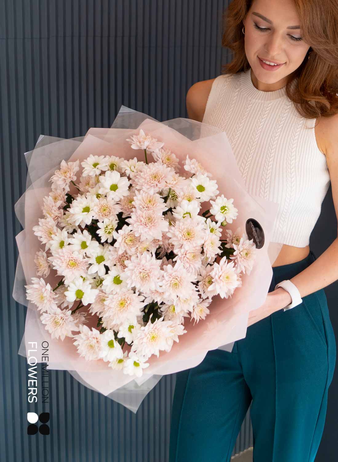 Букет "Сантини Палермо" Grand — это сочетание невероятной красоты и изысканности. В его составе вы найдёте 5 кустовых хризантем белого цвета и 10 кустовых хризантем розового. Эти цветы создают гармонию и наполняют букет свежестью, что делает его идеальным подарком для любого события.