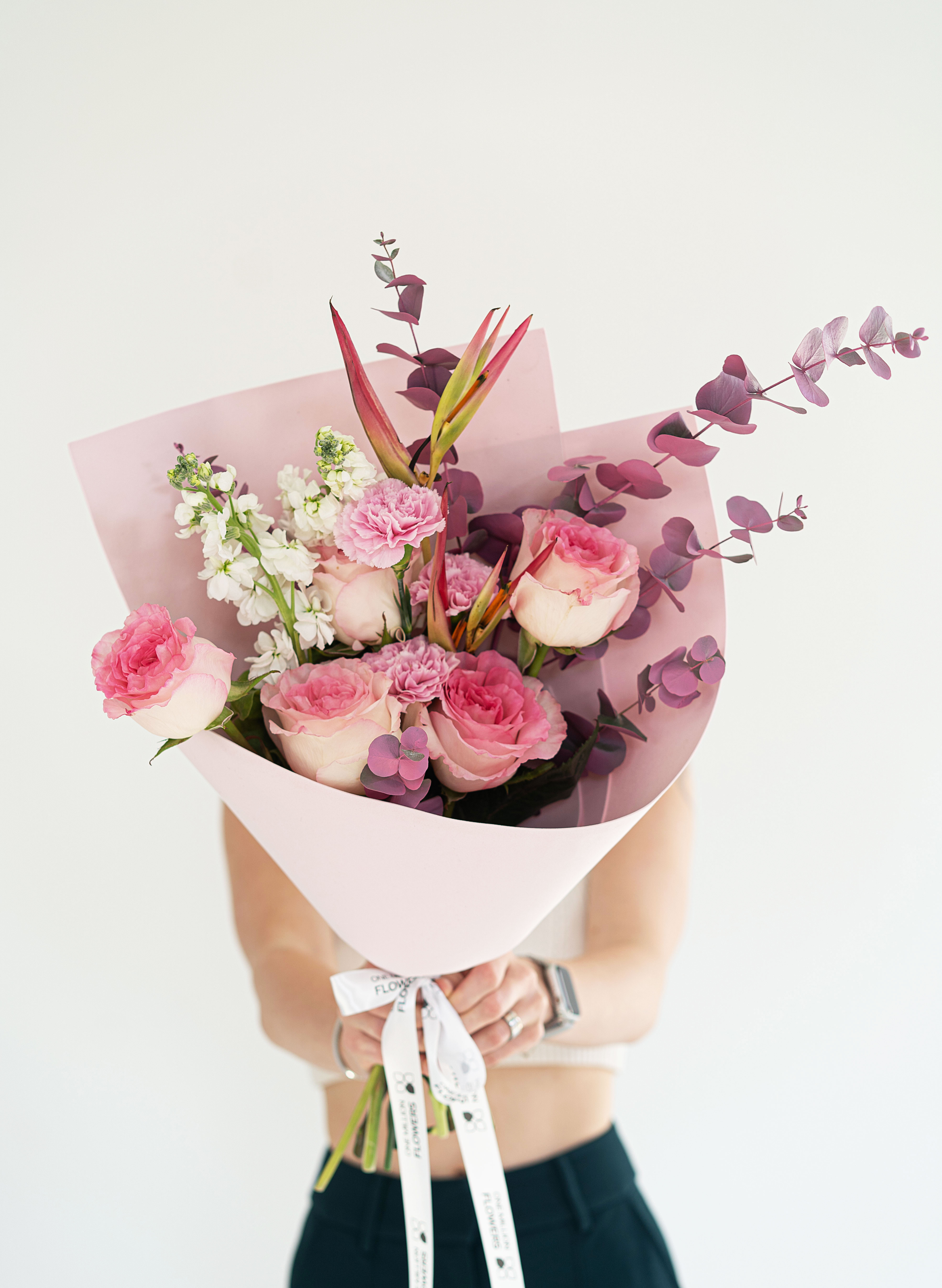 Роскошное сочетание цветов – теплые розовые оттенки гармонируют с белыми и зелеными акцентами, создавая нежный, но выразительный букет.
